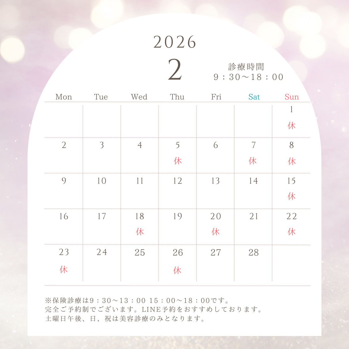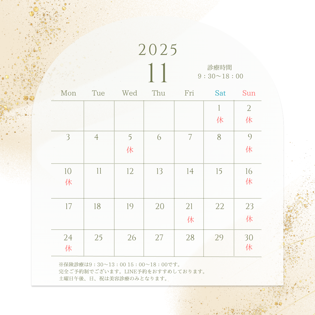 土曜日午後、日曜日、祝日は美容診療のみとなります。